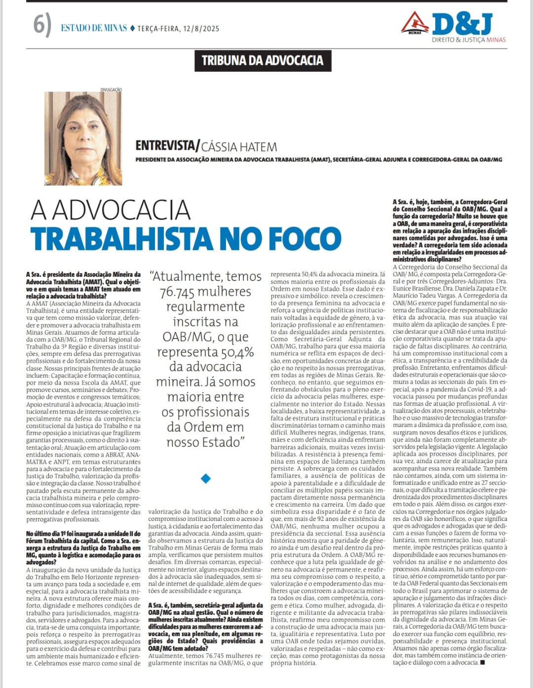 Entrevista da Presidente da AMAT, Cássia Hatem ao Jornal Estado de Minas à convite do  Presidente do Conselho Consultivo dos Diários Associados, Dr. Décio Freire, na semana da advocacia. Publicada em 12.08.2025