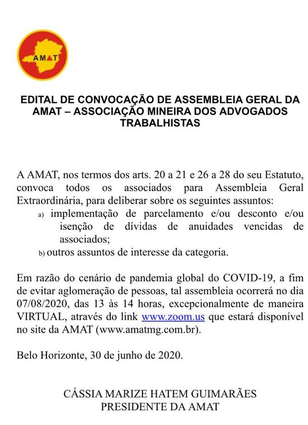 Edital de Convocação de Assembleia Geral da AMAT ASSEMBLEIA GERAL DA AMAT Entrar na reunião Zoomhttps://us02web.zoom.us/j/81408624776 ID da reunião: 814 0862 4776