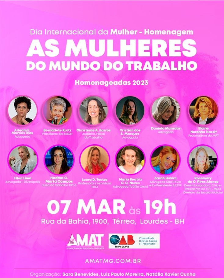 Em comemoração ao Dia Internacional da Mulher, no dia 7 de março, terça-feira, a Associação Mineira da Advocacia Trabalhista — AMAT e a Comissão de Direitos Sociais e Trabalhistas da OAB/MG — CDST, homenagearão Mulheres do Mundo do Trabalho que se destacam por sua história, atuação e liderança. Esperamos vocês para esse momento de trocas e confraternização!