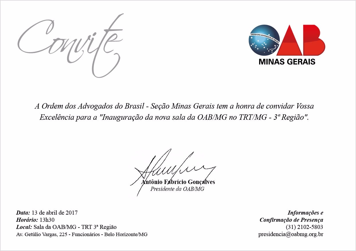 Convite OAB - Excelência para a " Inauguração da nova sala da OAB/MG no TRT/MG - 3ª Região".